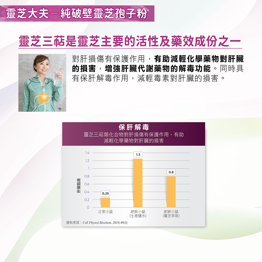 灵芝三萜类化合物对肝损伤有保护作用,有助减轻化学药物对肝脏的损害,增强肝脏代谢药物的解毒功能。同时具有保肝解毒作用,减轻毒素对肝脏的损害。