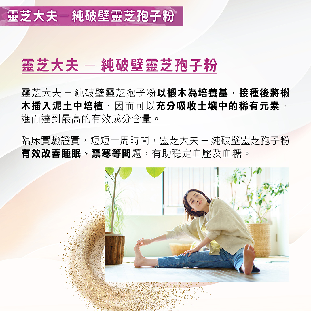 临床实验证实,短短一周时间,灵芝大夫-纯破壁灵芝孢子粉有效改善睡眠、御寒等问题,有助稳定血压及血糖。