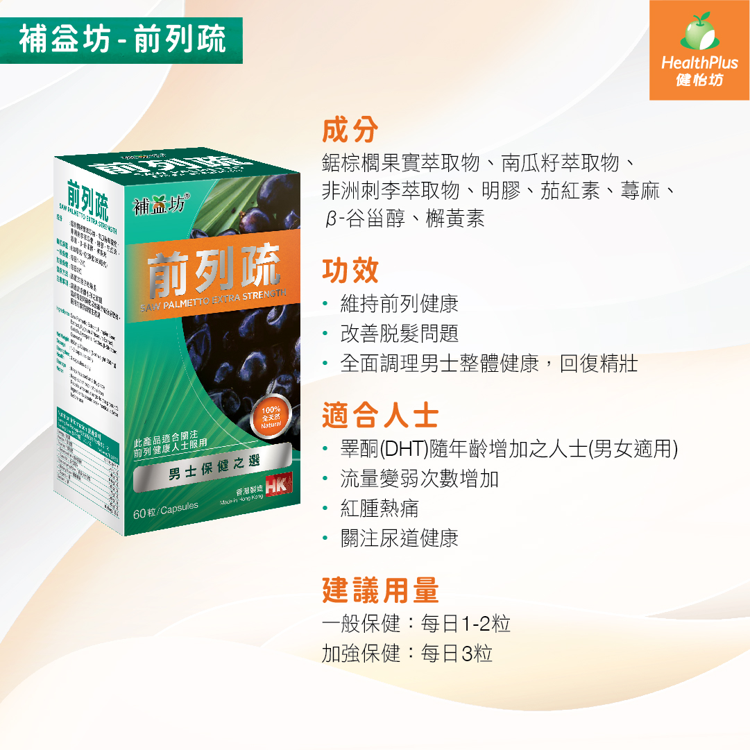 | 適合人士 | 睪酮(DHT)随年龄增加之人士(男女适用) 流量变弱次数增加 红肿热痛 关注尿道健康 |