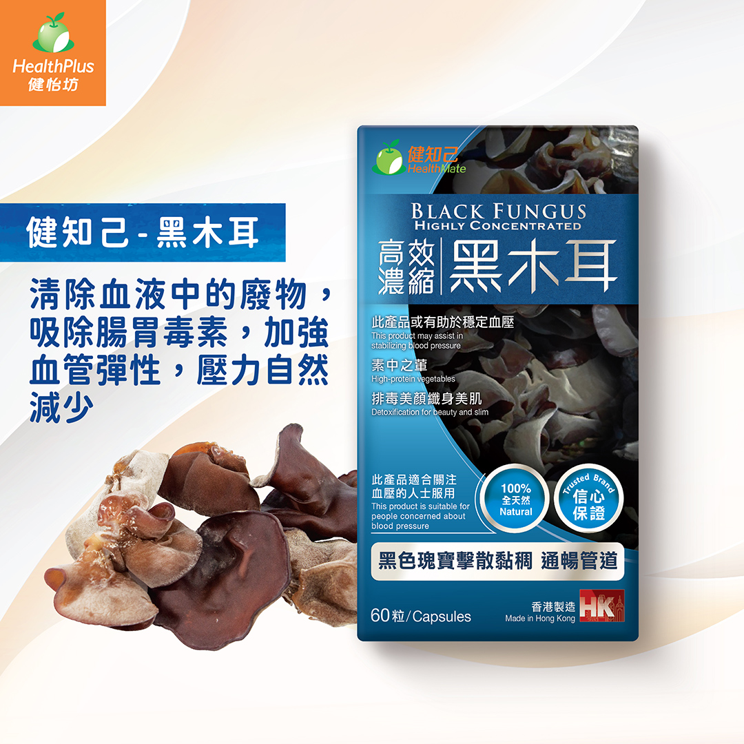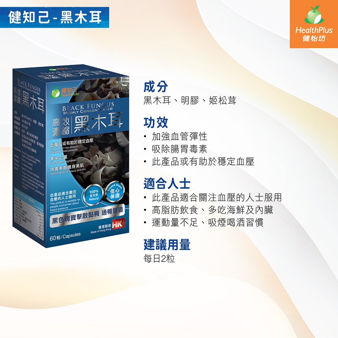 黑木耳多醣能清除血液中的廢物、減少有害物質沉積,從而加強血管彈性,血液更流暢,壓力自然減少,此產品適合關注血壓的人士服用。