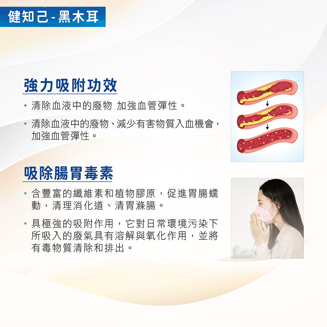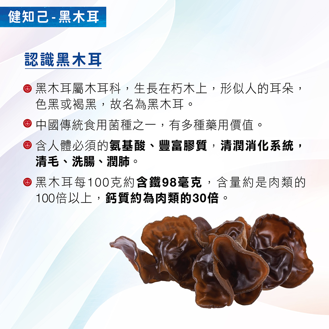 健知己- 高效濃縮 黑木耳採用先進技術提煉,含黑木耳多醣超於40%,能加強血管彈性。且含豐富纖維素和植物膠原,有效清除腸胃毒素。