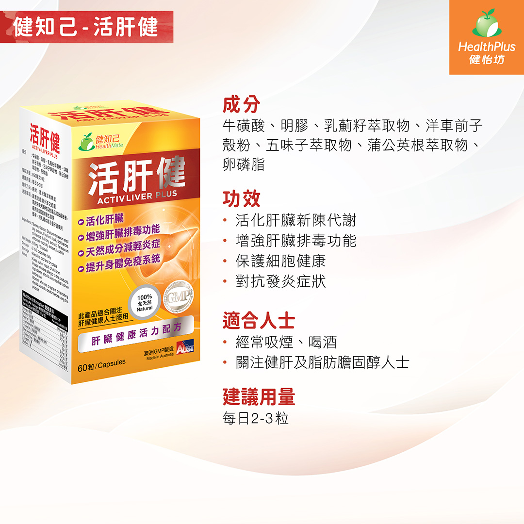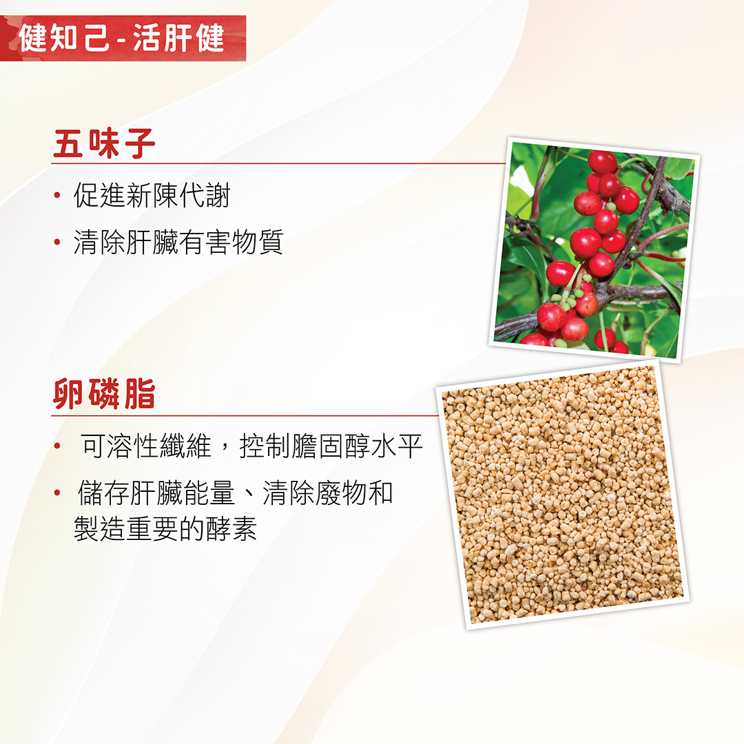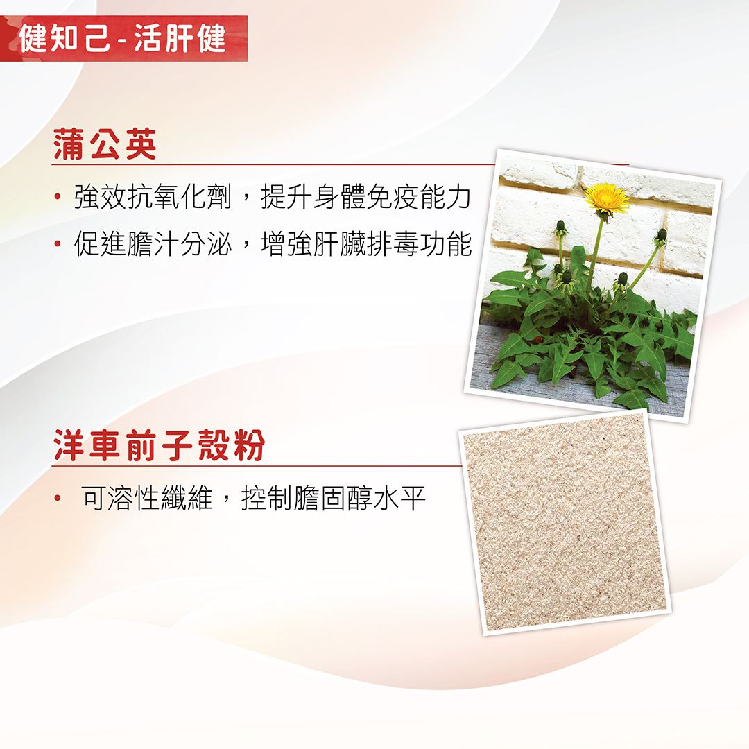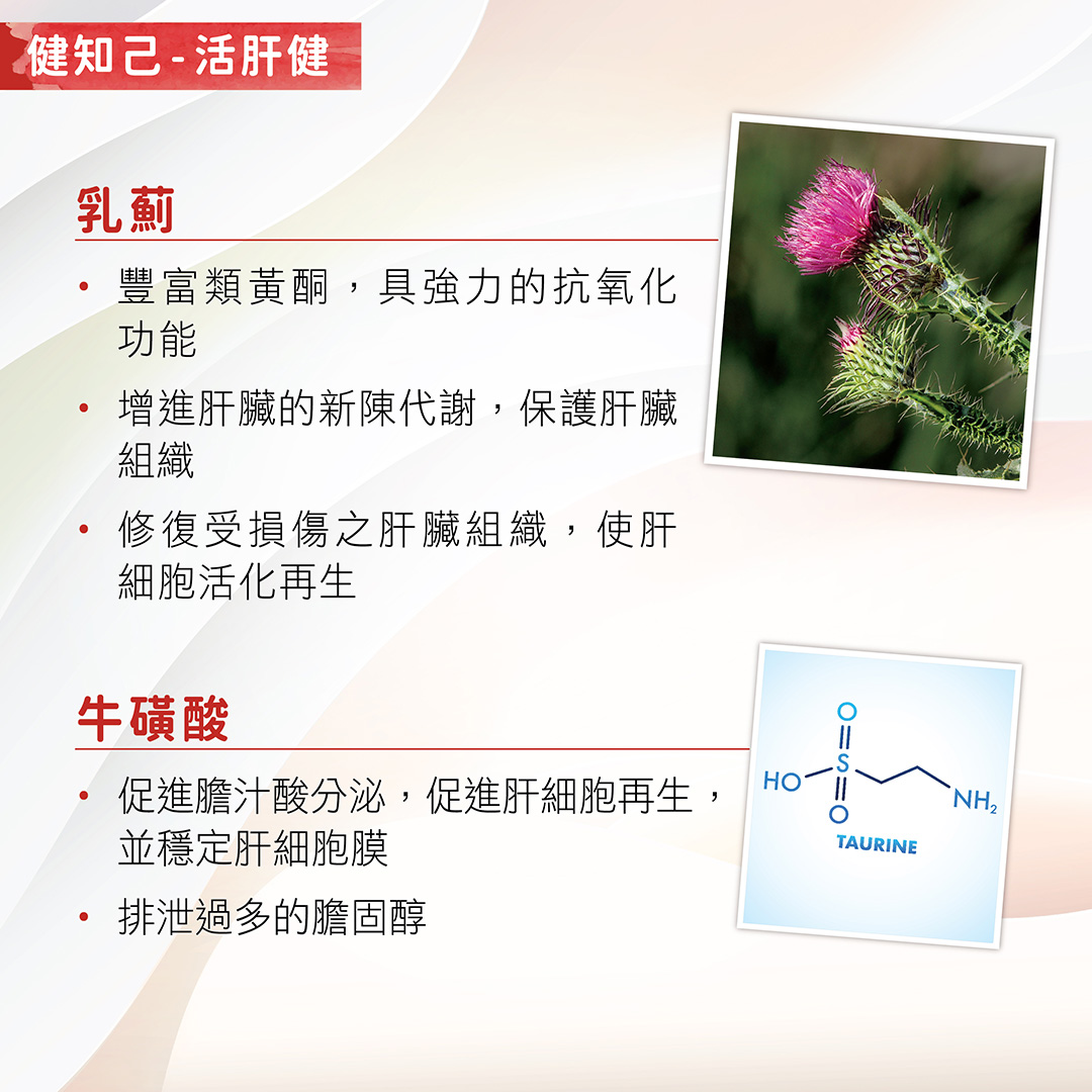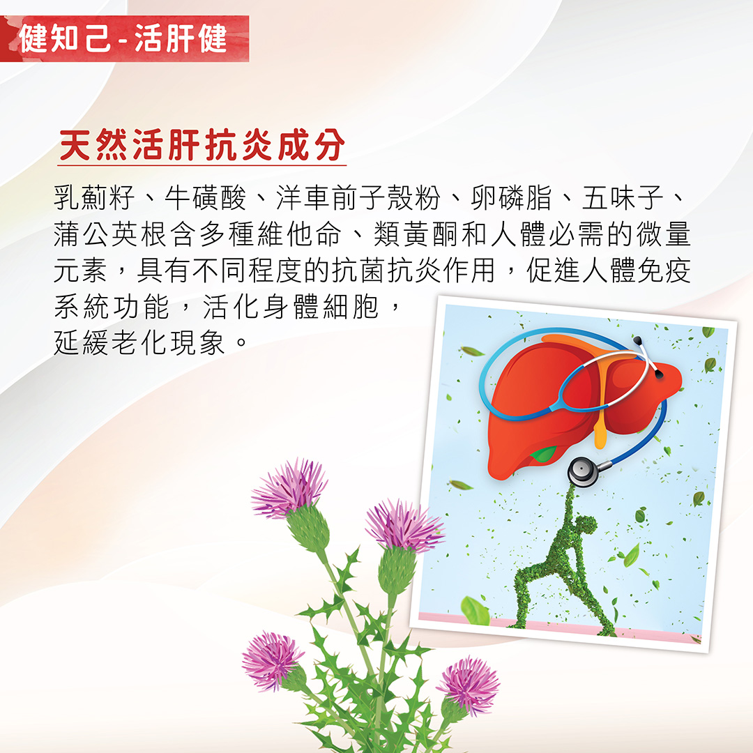 健知己-活肝健含天然活肝抗炎成分: 乳薊籽、牛磺酸、洋車前子殼粉、卵磷脂、五味子、蒲公英根含有多種維他命、類黃酮和人體必需的微量元素,具有不同程度的抗菌抗炎作用,並可促進人體免疫系統功能,有效對抗自由基損傷,活化身體細胞,延緩老化現象。
