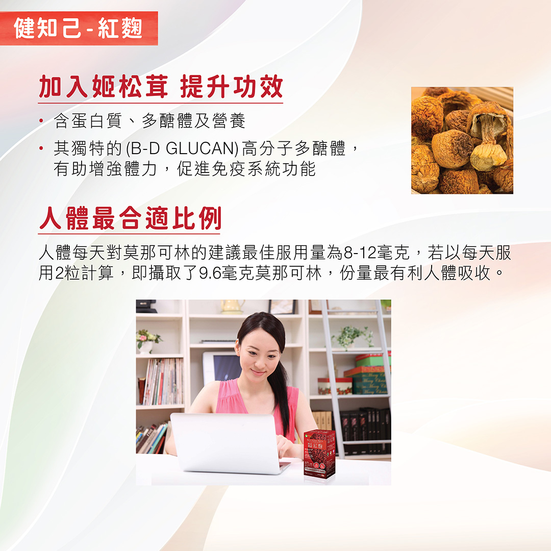 健知己–高效濃縮 紅麴所含莫那可林濃度達1.0%,比市面同類產品高2.5倍,功效更快更顯著。
