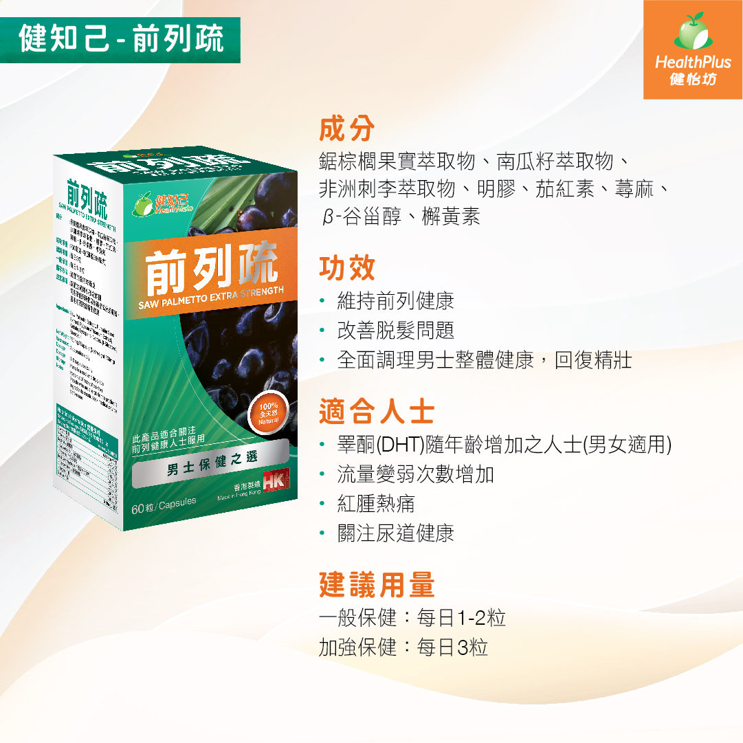 | 功效 | 維持前列健康 改善脫髮問題 全面調理男士整體健康,回復精壯 |